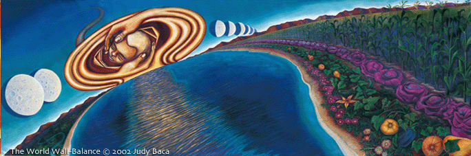 “Balance” represents the beliefs and prophecies of the native American Hopi Tribe. They believe that modern man is out of balance and that the human race needs to return to a stability (illustrated in this central panel) to survive through a harmony of unseen forces that hold nature in balance.