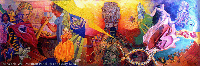 "Tlazolteotl: Creative Force of the Un-Woven" represents hope and joy after struggle and the promise of a new and better future. The optimistic, bright colour palette used together with recognisable historic monuments, emerging figures and handshakes between the old and new generations creates a strong visual image of the continuity and rebirth of life. |