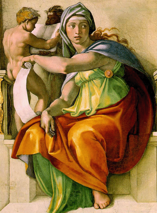 Here the contrast again is between human strength and the soft fabric disguising the solid marble beneath. This image also suggests that the Sibyl is well-grounded on a physical and psychological foundation.