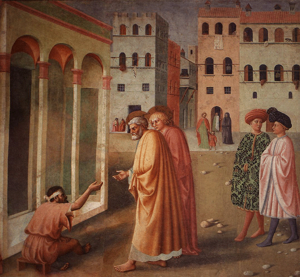 Masolino carefully details his painting of the luxurious cloaks of these distant passers-by. These gentlemen provide a link between the Healing scene on the one side and the Raising of Tabitha on the other, (just out of view of this picture).