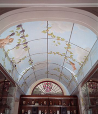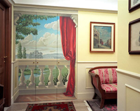 De Carolis continues to develop his individual style through other techniques including trompe-l’oeil (to fool the eye) paintings on oil, wooden panels and walls to create a sense of light and space in a wide selection of locations from residential villa, public offices, hotels and country chapels to a number of restaurants in the region of Emilia Romagna, one of Italy’s principal culinary centres. His work is deeply rooted in the traditional artistic craftsmanship so typical of Italy and he has established a strong reputation within his regional community. De Carolis recently created a series of contemporary wall designs for an agricultural cooperative that produces Modena’s celebrated balsamic vinegar.